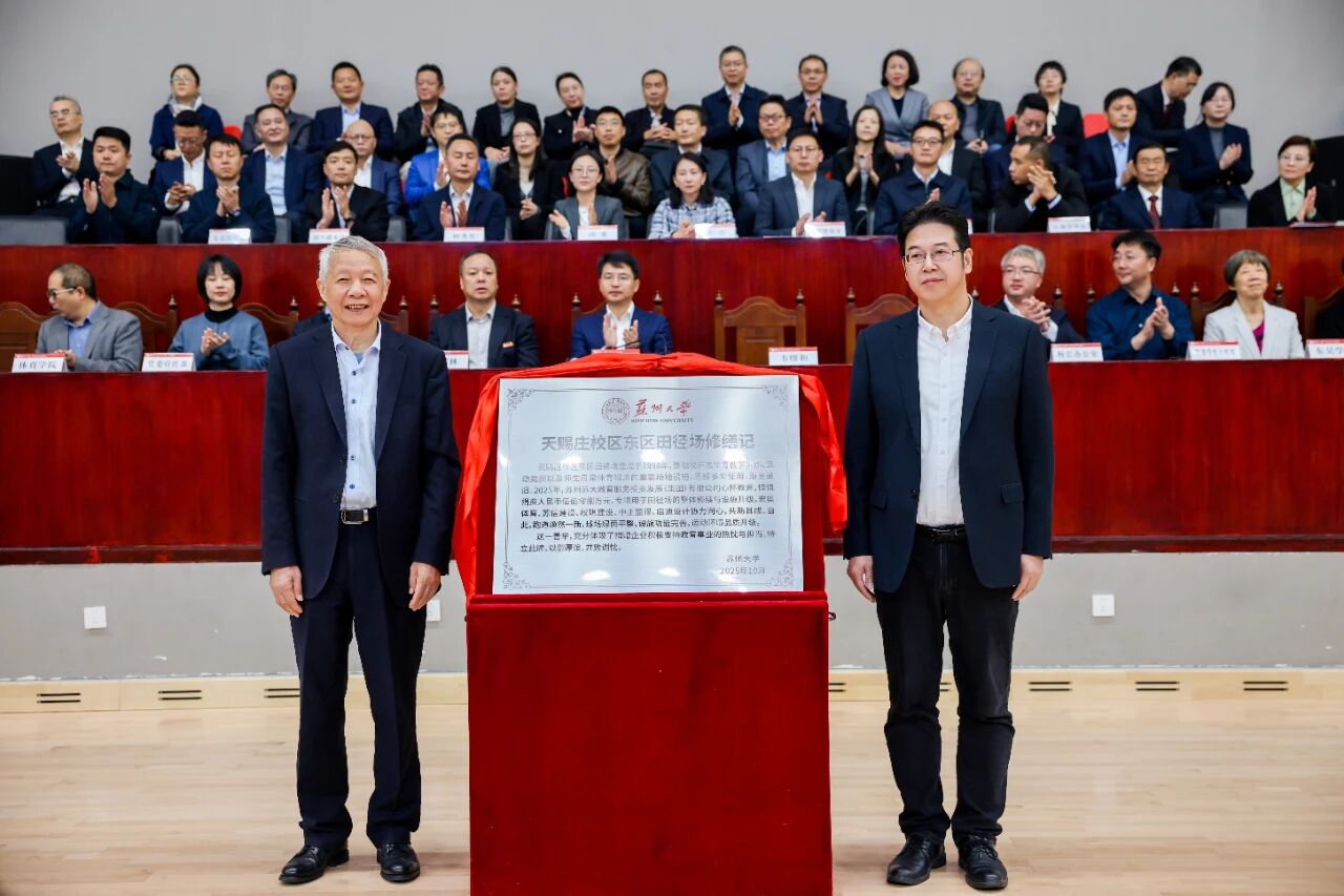 开幕式期间,苏州大学党委常委、副校长王云杰与集团董事长、总裁韦曙和共同为“天赐庄校区东区田径场修缮项目”揭牌,标志着历经数月升级改造的田径场正式投入使用,为苏大师生的体育生活注入全新活力。