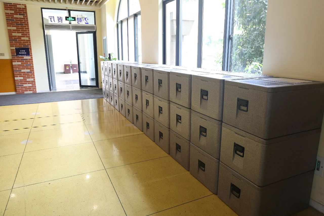 疫情期间,学校实行了配餐制,班级餐点独立装进保温箱,食堂专门设有退、取餐处,避免多人接触,影响卫生安全。