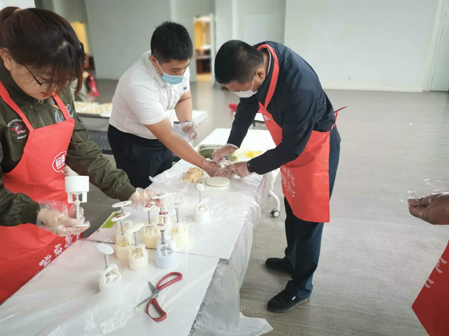 糕点师傅给大家讲解、示范月饼的制作方法,本次教大家的是较为简单的广式月饼,做面团→按面皮→装馅→封口→套模具→成型,说来也是简单的,但是最终月饼能否精致又美味,那还着实考验师生们的用心。老师讲解完之后,大家纷纷迫不及待的开始制作起来。